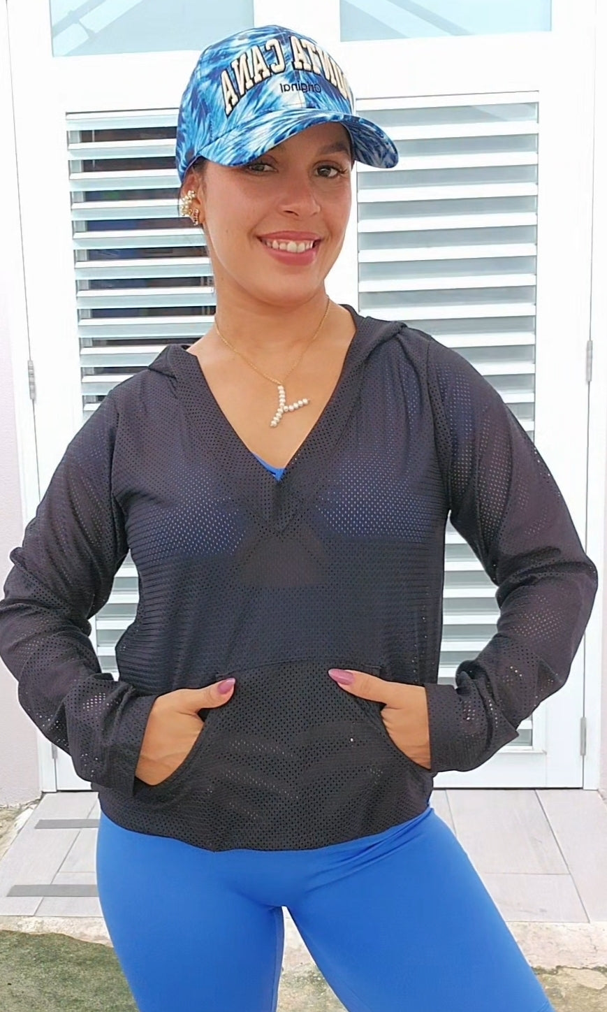 Perfecto para ir al gym porque es transpirable, transparenta un poco y es mega cómodo. Tiene elástico en mangas y el borde inferior. También tiene bolsillo al frente y gorro. No dejes perder este abrigo deportivo.